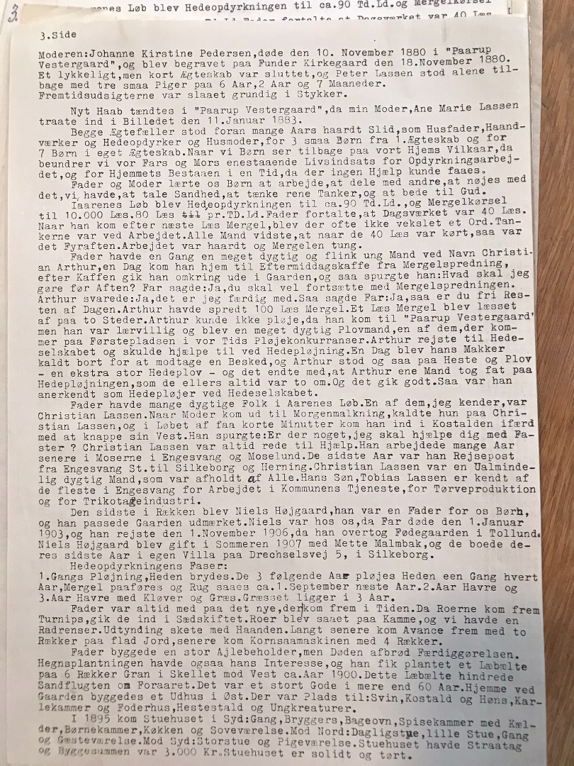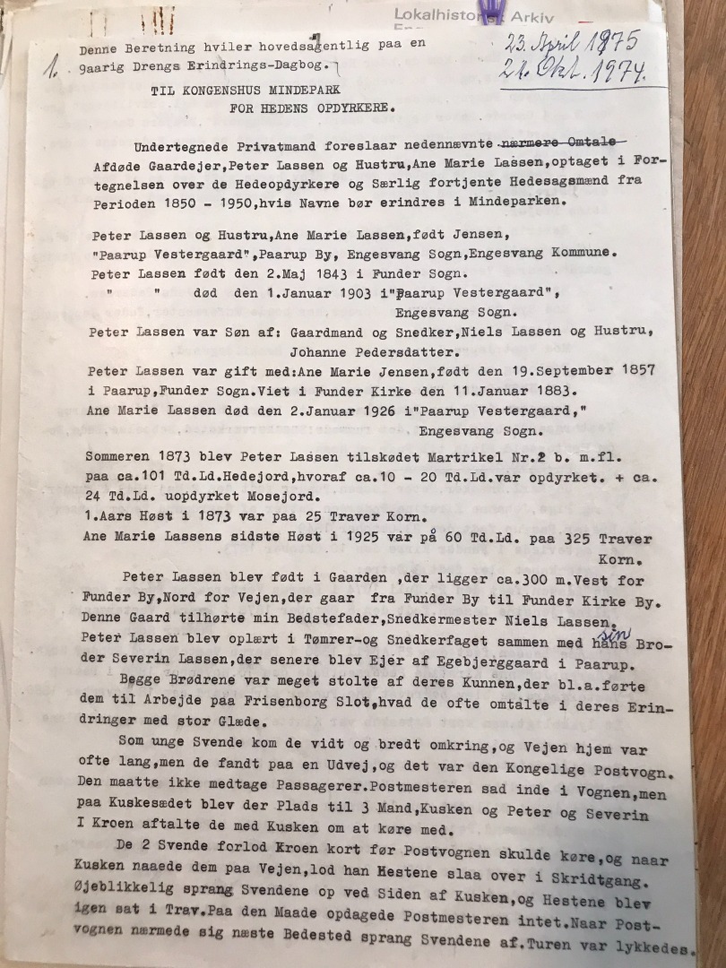 Peter Lassen (13-05-1893; ) skrev nedenstående indstilling til Hedeselskabet om sin far, Peter Lassen (02-05-1843; 01-01-1903), for at få ham nævnt på en mindesten i Kongenshus Mindepark.